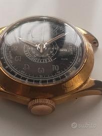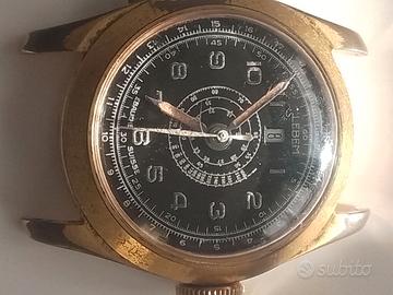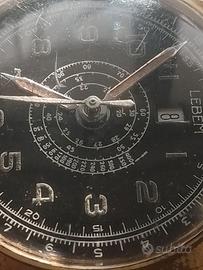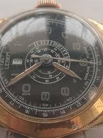 Affascinante cronografo vintage svizzero di marca Lebem, risalente agli anni '40 o primi anni '50. Un pezzo di storia dell'orologeria con un design tecnico e militare mozzafiato. ⚠️ ATTENZIONE: L'OROLOGIO NON È FUNZIONANTE. ⚠️ Viene venduto esclusivamente come pezzo da collezione, per parti di ricambio o per un progetto di restauro completo. Punti di forza per collezionisti: Quadrante Meraviglioso: Nero lucido (Glossy) con scala tachimetrica a chiocciola centrale e scala telemetrica esterna. Grafiche ancora molto nitide e ben leggibili. Stile Militare: Numeri arabi e lancette originali che conservano tutto il fascino del tempo. Cassa d'epoca: Design con tasti a oliva (molto ricercati) e fondello in acciaio a vite (screw-back) marchiato Lebem. Stato dell'oggetto: Meccanica: Movimento fermo, non funzionante.Ruotando la corona le lancette girano probabilmente da verificare bilanciere o parti meccaniche Estetica: La cassa presenta segni del tempo e perdita della placcatura (vedi foto di profilo e sulle anse). Il vetro plexiglass ha qualche graffio superficiale ma è integro. Componenti: Corona e pulsanti cronografici presenti. Venduto senza cinturino. Ottimo investimento per chi ripara orologi o per chi cerca un quadrante raro e originale per eventuale restauro