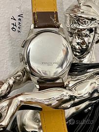 Raffinatissimo orologio con cronografo Vintage a carica manuale e di manifattura svizzera marca "L O Y A L" Cronografo a carica manuale anni ’40 con cassa OVER-SIZE del diametro di mm. 36 esclusa la corona dell’albero di carica. Fondello a scatto in acciaio inox. Macchina perfetta in ottime condizioni generali. Vetro PLEXI come nuovo e nessun segno. Perfettamente funzionante sia per la parte segnatempo che sembra molto puntuale, che per la parte cronografica che scatta ed azzera in modo ottimale perfettamente ad ore 12. Quadrante con scale medicali pulsometriche e biometriche ai bordi, contatori cronografo sovrapposti ad ore 6 ed ore 12 stile portoghese, applicazione numeri arabi agli indici e lancette dauphine originali ed in buono stato di conservazione. L'ultima revisione completa della macchina conosciuta risulta essere stata effettuata nel mese di marzo dell'anno 2021, di conseguenza anche se il movimento funziona si consiglia una mezza revisione o almeno una pulizia del calibro. Monta movimento meccanico a carica manuale di manifattura svizzera anni'40/'50 calibro VENUS*170 con smistamento della cronografia tramite RUOTE a COLONNA. Cinturino nuovo in pelle generico con fibbia generica. Se avete tempo date un'occhiata alle altre mie inserzioni. BREITLING - VALJOUX - LONGINES - UNIVERSAL GENEVE - LANCO - ZENITH - OMEGA - PHILIP WATCH - LONGINES - CERTINA - CITIZEN - VENUS - LANDERON - RADO - MIDO - LORENZ - WALTHAM - SEIKO - SWATCH - PERSEO - POLARIS - POLJOT - RAKETA - PAKETA - STOWA - IWC - EBERHARD -