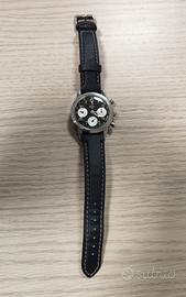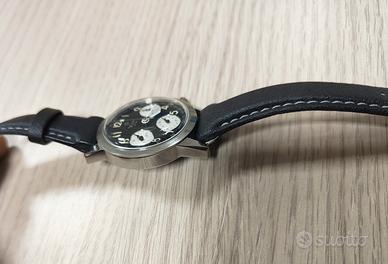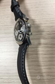 Cronografo Wyler perfettamente funzionante Wyler è un marchio di orologi svizzero con una ricca storia, sebbene meno conosciuto rispetto ad altre importanti case orologiere. Fondato nel 1896 dall'orologiaio Paul Wyler, il marchio si è distinto per le sue innovazioni tecniche, in particolare per lo sviluppo del sistema Incaflex nel 1927. Questa invenzione, consistente in un bilanciere brevettato progettato per assorbire gli urti senza rompersi, ha rappresentato un significativo progresso nel settore orologiero. Wyler ha acquisito notorietà grazie alle sue audaci dimostrazioni di robustezza dei suoi orologi, come nel 1956, quando ne fece cadere due dalla Torre Eiffel per provarne la resistenza. Questi orologi, che continuarono a funzionare perfettamente dopo la caduta, rafforzarono l'immagine di Wyler come produttore di orologi durevoli e affidabili, spesso indossati da professionisti in settori impegnativi o da appassionati di sport. Descrizione Quadrante: Panda rovesciato Diametro: 37 mm Materiale: Acciaio Vetro: Plexiglas Movimento: Movimento meccanico a carica automatica Valjoux 7750 Funzioni: Cronografo, ore, minuti, secondi Anno: Circa 1980 Referenza: 18.93.1737