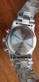 Cinturino Acciaio INOX colore argento con chiusura di sicurezza, secondo cinturino in pelle, cassa in Acciaio INOX, Spessore: 12,0 mm, Diametro: 43,0 mm, Colore quadrante: Blu, Materiale lunetta: Acciaio INOX placcato, Funzione lunetta: Tachimetro, Tipo di vetro: Minerale, Movimento: Al quarzo, Calendario: Data, Classificazione di impermeabilità: 10 bar
