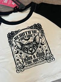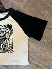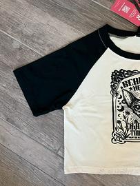 Il modello è elasticizzato, a maniche corte, comodo e valorizzante, ideale da abbinare a jeans a vita alta, cargo o gonne per un look urban, Y2K o dark street.