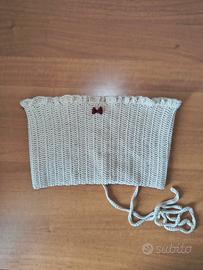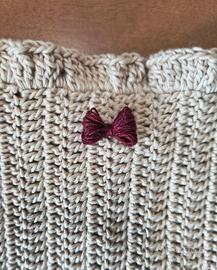 Design a fascia con lavorazione a coste verticali, bordino ondulato nella parte superiore e grazioso fiocchetto bordeaux cucito al centro per un tocco romantico.