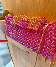 Borsetta gioiello da sera o da cerimonia in cristalli e perline acriliche colore rosa intenso e rosa cipria.