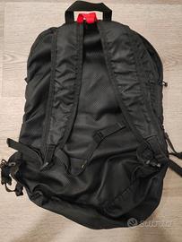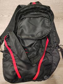 richiuso nell’apposita tasca a zip, occupa pochissimo spazio ed è facilmente trasportabile. La stessa tasca a zip, una volta aperto lo zaino, rivoltandola funge da tasca interna per gli effetti personali etc.;