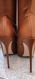Cuissard Eva 120 mm N° 40.5 tacco a spillo 12 cm LeSilla, in pelle vegana elasticizzata colore brick (marrone cgiaro) . Lunghezza del gambale molto oltre il ginocchio, senza zip molto facili da indossare. Sono molto femminili. Sono usati con qualche diffetto, nella parte superiore del gambale e un piccolo segno sull tacco, vedi molto bene le immagini.
