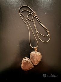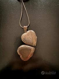 Catenina con pendente a ( Cuore portafoto)x4 foto, in argento 925 . Dimensioni: catenina cm. 60; Cuore tutto chiuso cm.2.5X2,5: aperto, con tutti e 4 i cuori, cm. 5 X cm.5. Il tutto in argento 925.Peso cuore 15g., catenina 6g.