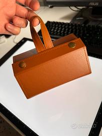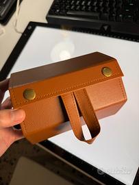 Organizer pieghevole per occhiali da sole, rivestimento esterno in similpelle marrone, interno morbido protettivo.