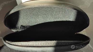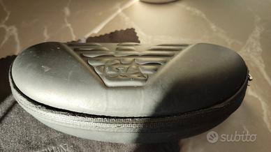 Custodia per occhiali nera Giorgio Armani, in materiale plastico con rivestimento in tessuto. Con panno x pulizia logato. Misure: lunghezza 16,5 cm, altezza 5 cm, profondità 5,5 cm