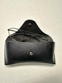 Custodia per occhiali da vista o da sole In finta pelle nera morbida con bottone per chiusura e rinforzo interno per nasello Nuova, mai usata V7