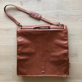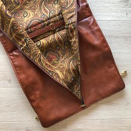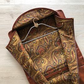 Elegante custodia porta abiti da viaggio in ecopelle marrone con maniglia e tracolla. Rifiniture in metallo dorato. Foderata in tessuto fantasia pasley. Mai usata, ma con segni del tempo.