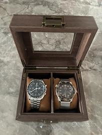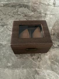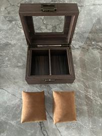Robusto contenitore porta orologi in legno con finitura scura, ideale per custodire i tuoi preziosi segnatempo, smartwatch o gioielli . - Struttura in legno con venature a vista. - Interno foderato in morbido tessuto per non graffiare la cassa o il cinturino dell’orologio - Diviso in 2 scomparti per contenere due orologi - Coperchio trasparente in vetro, ideale per orologi con carica solare - Chiusura a gancio metallico. Nuovo, mai usato NB: gli orologi NON sono inclusi nel prezzo