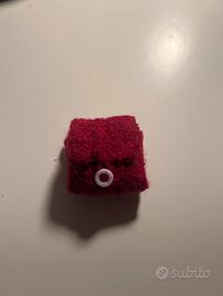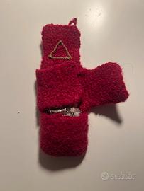 Il modello in foto è lavorato in lana di alpaca rossa ed è arricchito dal simbolo dyella trinità cucita.