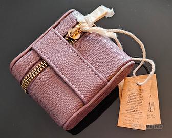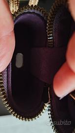 Custodia viola/lilla con inserti dorati Carpisa porta auricolari/cuffie/airpods (ma adatto anche per svariati usi come porta monete, porta caricabatterie, porta sigarette, piccola borsetta, ecc.); nuova con ancora confezione d'acquisto originale e parti delicate fasciate. Possibilità di togliere catenina o metterla all'interno.