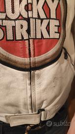 Giacca moto in pelle Dainese Kevin Schwantz anno 95 originale vedi etichetta di originalità. Giacca vissuta, vintage vero, no strappi, no rotture solo segni di usura come mostrano le foto. La persona che la indossa misura di spalle 50cmn, altezza 1.85, giro vita (pancia) 90cm taglia 52