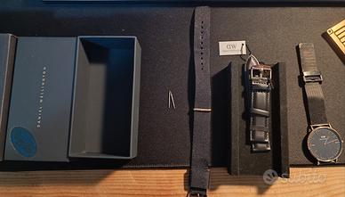 Indossato poche volte dall'acquisto, il packaging comprende orologio e 3 cinturini originali DW rispettivamente in pelle nera, stoffa blu e maglia nera.