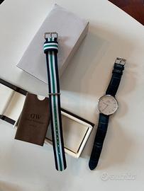 • Cinturino 2: Originale Daniel Wellington tipo NATO a righe (blu/bianco/verde) con fibbia logata, perfetto per uno stile più casual.