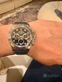 Rolex Daytona referenza:116519 seriale Z….. del 04/2008 , movimento:4130, cassa 40 mm, vetro zaffiro , quadrante nero con indici in diamandi e numeri arabi 15/30/45 cinturino pelle nero di coccodrillo in più aggiunto cinturino in gomme del rubber…. Aquistato in concessionario ufficiale con tanto dí scontrino!!!!!!Chiusura deployante, completo di scatola contro scatola , tag, libretti, e garanzia card tedesca. Non trattabile, offerte ridicole verranno immediatamente cestinate, primo contatto via E -MAIL, visibile in gioielleria e video sorvegliata per tutela di entrambe le parti dichiaro l’originalità dell’orologio