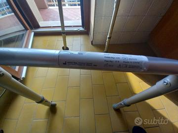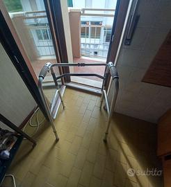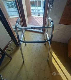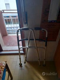 Deambulatore girello pieghevole dotato di due ruote e di un sistema frenante collaudato a puntali. Da usare in casa o all'aperto..Deambulatore costruito in robusto ma leggero alluminio anodizzato, regolabile in altezza dotato di due ruote ruotanti anteriori e due puntali posteriori antiscivolo. Leggero e comodo da trasportare con telaio in alluminio che una volta piegato e chiuso occupa uno spazio ridotto di soli 11 cm. Nella foto 4 lo vedete chiuso..precuso che la prima foto è presa dalle istruzioni mentre le restanti sono reali del presidio medico in cessione. Fabbricato da nota azienda del settore come presidio medico con marcatura CE per anziani e disabili e attrezzo di questa marca consigliatomi dal fisiatra ortopedico. Particolarmente adatto quindi alle persone anziane ( anche per quelle che deambulano tranquillamente in quanto serve anche per dare loro sicurezza) o comunque persone con difficoltà a deambulare, i puntali posteriori in gomma progettati appositamente antiscivolo oppongono una leggera resistenza al movimento dando una maggiore sicurezza alla persona che lo utilizza. Ottima alternativa alle stampelle, stampelle che sconsiglio per pericolo cadute.