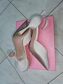 Sono di un colore chiaro, probabilmente bianco sporco o beige, con una finitura lucida (vernice).Presentano una punta affusolata e un tacco a rocchetto di media altezza.Il cinturino alla caviglia ha una fibbia metallica.L'interno della scarpa, visibile nell'immagine, indica la presenza dimemory foamper un maggiore comfort.Le scarpe sono posizionate sopra la loro scatola rosa, sulla quale è ben visibile il marchio. INDOSSATE SOLO 1 VOLTA.