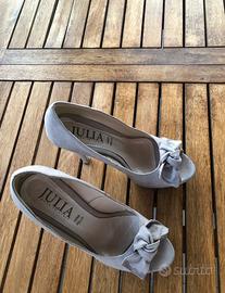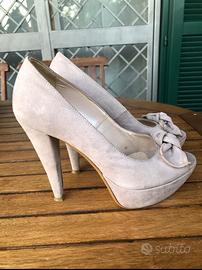 Vendo un decollete con punta aperta in pelle scamosciata beige per la stagione primavera-estate. Insossato qualche volta in occasione. Vendo perche non porto piu il tacco alto