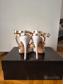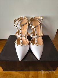 Eleganti décolleté bianche con un design a punta e cinturino alla caviglia. Le scarpe sono impreziosite da borchie dorate.