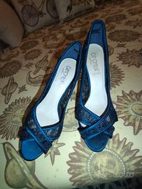 Décolleté blu Camomilla, numero 39, usate pochissimo come si vede dalle foto. Vera pelle, tessuto tipo raso e pizzo incrociati sul davanti. Linea molto bella ed elegante. Trama super traspirante. Elastico all'interno della scarpa a livello del tallone, per tenere fermo il piede.