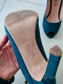 Décolleté blu navy opaco scamosciate, con apertura per alluce e cinturino alla caviglia. Tacco di 10 cm.