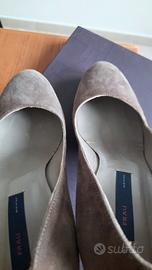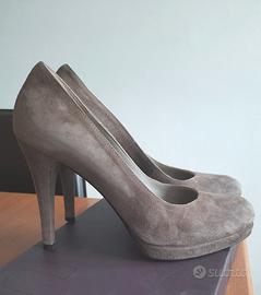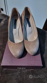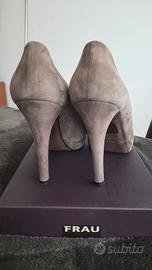 Stupende décolleté n. 39 in vera pelle scamosciata di colore beige grigio o taupe, interno scarpa in pelle e suola in vero cuoio. Sono del noto calzaturificio italiano Frau, caratterizzate da una punta leggermente arrotondata, tacco alto a stiletto e un leggero plateau anteriore, comode da portare. Messe pochissimo, sono in ottimo stato. Le ombreggiature nelle foto sono proprie del camoscio. Vendute con la scatola originale. Chiedete per qualsiasi altra informazione. Possibile consegna a mano.
