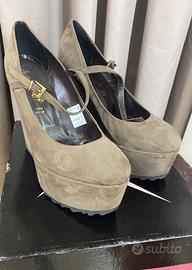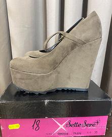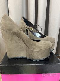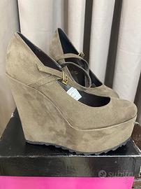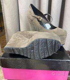 Bellissimo décolleté in camoscio color tortora, con cinturino , numero 38 , zeppa alta 140. Mai utilizzato perché troppo alto per me