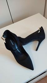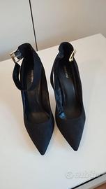 Bellissime décolleté in camoscio nero con cinturino alla caviglia con fibbia gioiello. Super eleganti e raffinate. Numero 39, tacco 12 cm. Usate solo una volta per una cena di gala, praticamente nuove.
