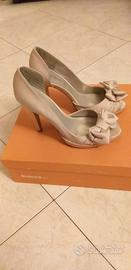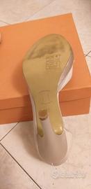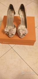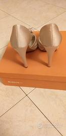 Decollete in pelle e tessuto bianco-beige satinato, taglia 37, tacco 10 con plateau. Ho fatto solo qualche camminata in casa, non lo mai usato fuori. Marca Dive&Co, lavorazione artigianale.