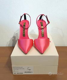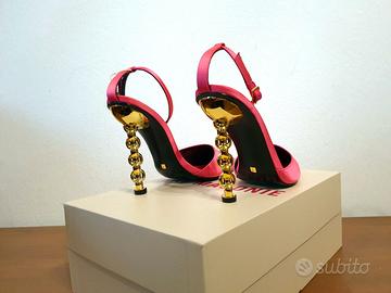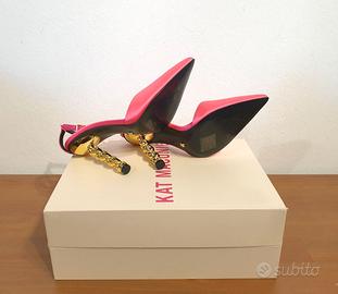 Ecco qui una versione ancora più sexy delle nostre ormai iconiche scarpe con tacco a catena by Kat Maconie. Realizzate in raso rosa scuro, queste décolleté con tacco a spillo e catena dorata ti faranno fare un figurone Perfette per aggiungere un tocco di glamour a qualsiasi outfit. N.37 Prezzo retail €410,00 PRODOTTO IN ITALIA Prodotto di provenienza italiana, sinonimo di qualità e creatività. COMPOSIZIONE: 95% Raso, 5% Pelle di bovino MISURE: Altezza tacco 10,5 cm DETTAGLI: Decolleté, Tinta unita, Raso, Interno in pelle, Suola in gomma, Cinturino alla caviglia con fibbia, Punta stretta, Tacco scultura, Finiture in pelle