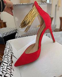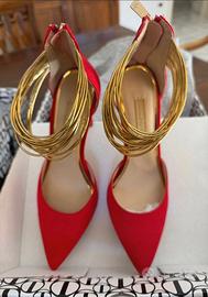 Vendo scarpe col tacco décolleté in camoscio colore corallo e multifili dorati alla caviglia; zip sul tallone Misura 38 Marca PriamaDonna Condizioni: pari al nuovo