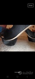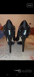 Eleganti décolleté nero aperte. Sulla parte posteriore presenti applicazioni brillanti a farfalla. Presentano plateau sulla pianta di 2.5 cm, altezza tacco 9cm.