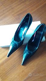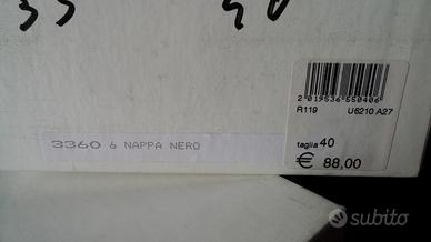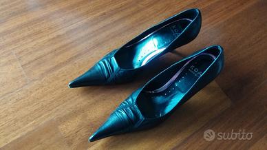 Vendo decollete di nappa nere nuove, indossate solo una vota, con punta, arricciatura e nastri come decoro, tacco a rocchetto alto cm 6.5, in pregiato pellame, suola in vero cuoio e 100% made in Italy, mis.40. Pagate 88 eu le vendo a 50 eu. Per vederle e/o provarle scrivere all'indirizzo mail indicato.