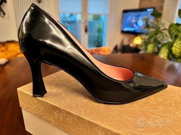 Décolleté eleganti in vernice nera lucida, dal design classico e femminile. La punta affusolata slancia la figura, mentre il tacco medio-alto garantisce un perfetto equilibrio tra stile e comfort. L’interno in rosa cipria aggiunge un dettaglio raffinato e ricercato. Ideali per l’ufficio, cerimonie o occasioni serali, queste scarpe sono un must-have versatile e senza tempo.