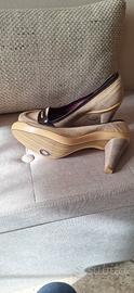 Décolleté donna in camoscio beige con bordatura in vernice marrone. Tacco legno 7,5 cm. Marchio: Passion