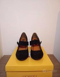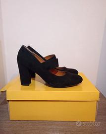 décolleté donna con tacco alto 7 cm. In camoscio. Cinturino e bottone decorativo.