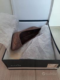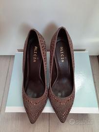 Décolleté donna "Alicia", n 39, colore tortora con borchiette bronzo, tacco 10 cm, indossate poche volte, tenute nella scatola originale.