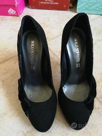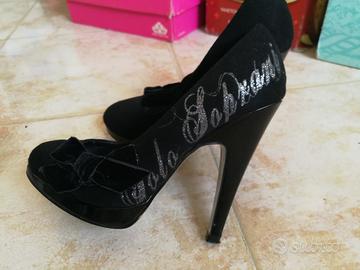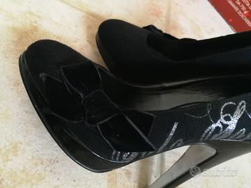 Décolleté con plateau e tacco numero 36 in pelle scamosciata color nero con scritta in glitter argento