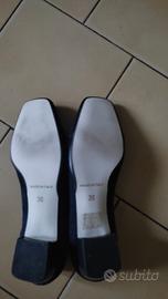 vendo décolleté con fibbia color oro, punta quadrata, in camoscio blu
