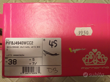 Décolleté marca Fornarina, a punta, con tacco basso, color pesca con inserti in tartan scozzese multicolor, numero 38, usate pochissime volte!
