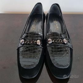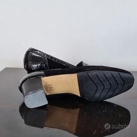 Décolleté Gabor in vernice nera con stampa effetto coccodrillo. ► Marca: Gabor ► Taglia: 38 ► Colore: Nero lucido ► Tacco: Circa 5 cm, largo e stabile ► Materiale: Vernice effetto cocco ► Dettagli: Catena argentata decorativa con elementi metallici ► Suola: Gomma antiscivolo Condizioni: Ottime