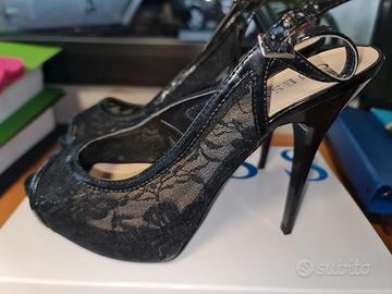 Tacco 13, plateau 2,5cm. Punta aperta, rivestimento in pizzo. Numero 10US - 40 IT. Provate con antitaccheggio, arrivata a casa purtroppo mi sono resa conto che fossero grandi di conseguenza inutilizzabili.