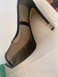 Elegante décolleté nera traforata con tacco oro e nera comoda