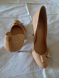Decollete Guess nocciola taglia 40, bicolor con tacco a intarsio dorato, plateaux interno invisibile cm 1,5, tacco cm 11,5, indossati solo 2 volte, completo di sacchetto