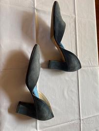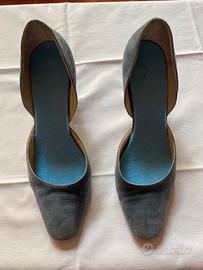 Décolleté elegante e moderna, in camoscio color azzurro polvere, con linea asimmetrica che valorizza il piede.