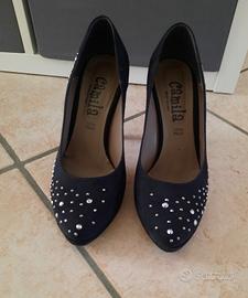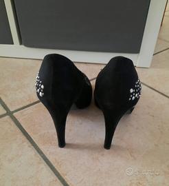 Décolleté in camoscio nero con strass-borchie, suola in vera pelle, tacco 10cm, marca Camila Usate pochissimo
