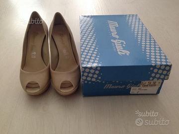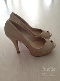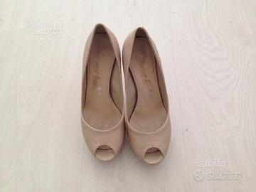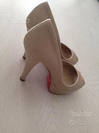 Vendo scarpe decolleté originali Mauro Giuli Made in Italy, usate poco ma con qualche leggero segno di usura, di colore beige in pelle morbidissima, suola rossa e tacco 11 cm, numero 36.