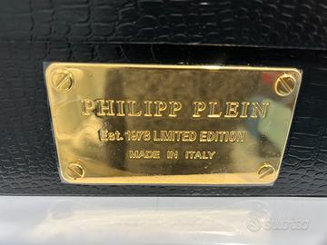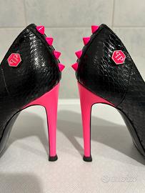 Décolleté nera in rettile Philipp Plein con tacco rosa e borchie, scatola, sacchetto per la pilvere e tacchetti di ricambio.
